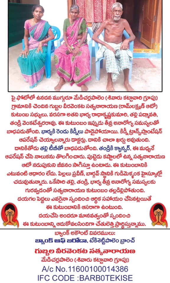 మేడిచర్లపాలెం (గుడిమెళ్ళంక శివారు) గ్రామానికి చెందిన గుబ్బల వీర వెంకట సత్యనారాయణ (రామ లక్ష్మణ్ ఆటో) అతని భార్య రాధా కృష్ణ కుమారి, తల్లి పద్మావతి, తండ్రి వెంకటేశ్వరరావు. ఈ కుటుంబం ఇప్పుడు తీవ్ర అనారోగ్య సమస్యలతో బాధపడుతోంది. భార్యకి రెండు కిడ్నీలు పాడైపోయాయి.