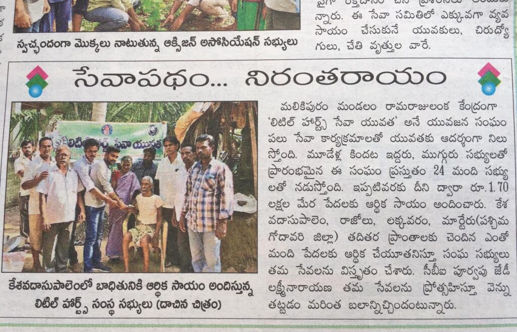 మలికిపురం మండలం గొల్లపాలెం పాత కాలనీకి చెందిన ఉండ్రాసి శ్రీనివాసరావు డెంగ్యూ వ్యాధి తో అతి చిన్న వయసులో మరణించడం జరిగింది. అతనికి సంవత్సరం కుమారుడు మరియు భార్య గర్భవతి. వీరి యొక్క దీని పరిస్థితిని తెలుసుకున్న లిటిల్ హార్ట్స్ సేవ యువత ఆ కుటుంబానికి